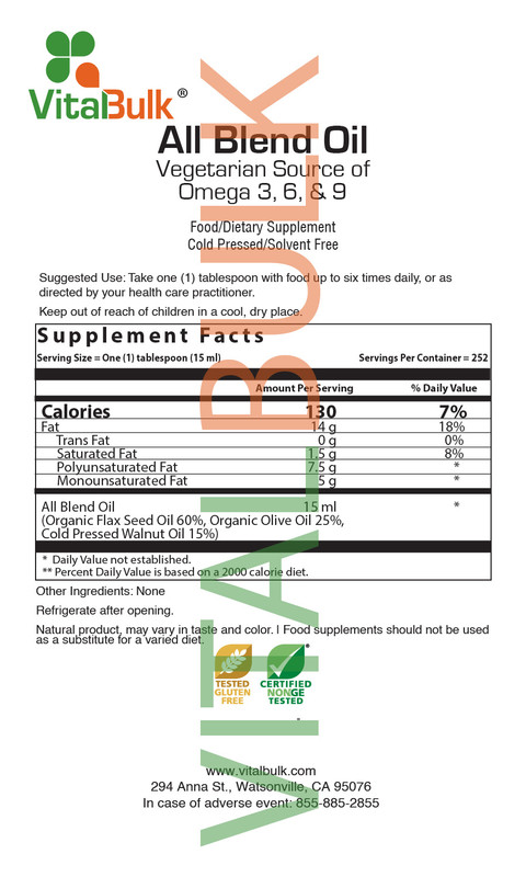 VitalBulk’s vegetarian All Blend Oil has a smooth and flavorful profile in every spoonful. Our choice in oils is designed to maximize the benefits of Omega 3 polyunsaturated fatty acids and beneficial Omega 9 monounsaturated fatty acids. VitalBulk’s healthy 2:1 Omega 3: Omega 6 ratio, helps maintain a healthy lipid balance in the modern diet. Flaxseed oil contains more Omega-3 fatty acids than any other commercial plant. Olive oil provides beneficial Omega 9, plus natural antioxidant polyphenols and oleic acid. Walnut oil provides the unique bonus of being 2/3 polyunsaturated fatty acids with a rich, full-bodied flavor.