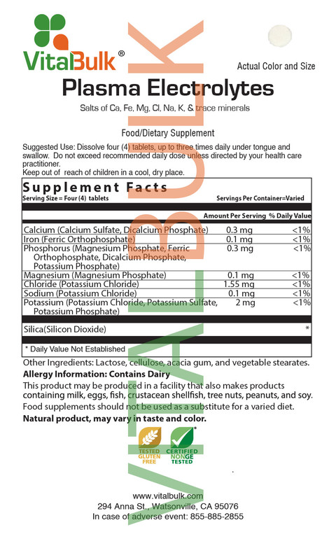 Plasma Electrolytes Tablet - Active Ingredients: Calcium (Calcium Sulfate, Dicalcium Phosphate) 0.3 mg, Iron (Ferric Orthophospate) 0.1 mg, Phosphorus (Magnesium Phosphate, Ferric Orthophosphate, Dicalcium Phosphate, Potassium Phosphate) 0.3 mg, Magnesium (Magnesium Phosphate) 0.1mg, Chloride (Potassium Chloride, Sodium Chloride) 1.55 mg, Potassium (as Potassium Chloride Potassium Sulfate, Potassium Phosphate) 2 mg, Silica (Silicon Dioxide *). Other Ingredients: Lactose, cellulose, acacia gum, and calcium stearate.