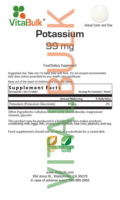 Potassium 99 mg Tablet - Active Ingredients: Potassium (as Potassium Gluconate) 99 mg. Other Ingredients: Cellulose, stearic acid, silicon dioxide, magnesium stearate, glycerin.